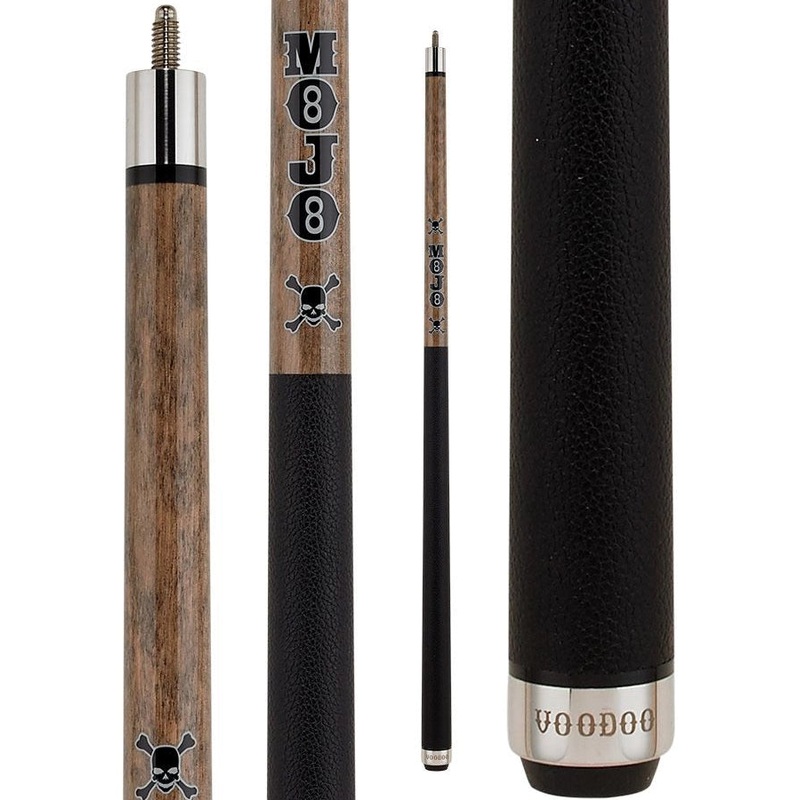 Description Warranty Information The Voodoo VODBK02 Mojo Break Cuefeatures a skull and cross bones designs with leather wraps.The shaft is built from AAA grade Canadian hard rock maple with 13" pro taper, a 1" phenolic ferrule, and a 13mm super hard packed